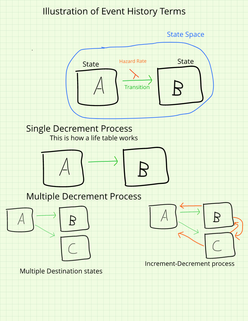 Every event history analysis begins by defining the state space: the complete set of mutually exclusive and exhaustive conditions in which a study subject can exist at any given moment. A state is a discrete condition that an individual occupies — alive or dead, married or unmarried, employed or unemployed. The state space is the full set of alternatives. In the simplest and most common case, we have a two-state system, but more complex analyses may involve multiple origin and destination states; for example, a study of contraceptive use might distinguish among nonuse, traditional methods, and modern methods as separate states. When a subject moves from one state to another, that movement is called an episode, an event, or a transition. The time spent in a particular state is the duration, measured along a time axis that specifies the unit of measurement: days, months, years, or whatever scale is appropriate to the process under study.