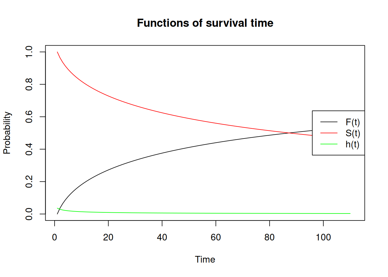 Ft <-cumsum(dlnorm(x =seq(0, 110, 1), meanlog =4.317488, sdlog =2.5))ft <-diff(Ft)St <-1- Ftht <- ft / St[1:110]plot(Ft, ylim =c(0, 1), xlab ="Time", ylab ="Probability",type ="l", main ="Functions of survival time")lines(St, col ="red")lines(ht, col ="green")legend("right", legend =c("F(t)", "S(t)", "h(t)"),col =c("black", "red", "green"), lty =1)