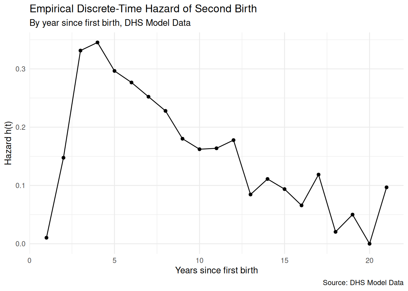 The key conceptual move in the discrete-time framework is a transformation of how we think about our data. In the person-level format we are accustomed to, each row represents one individual, with columns recording their total duration at risk and whether they eventually experienced the event. In the person-period format, each row represents one person in one time period. A woman who was at risk of a second birth for four years and then had one would contribute four rows to the data — three with a 0 in the event column and one final row with a 1. A woman who was observed for six years and did not have a second birth would contribute six rows, all with 0s. This expansion of the data from one row per person to potentially many rows per person is what creates the structure we need to model the period-specific hazard — the conditional probability of the event occurring in each time interval, given that it has not yet occurred.