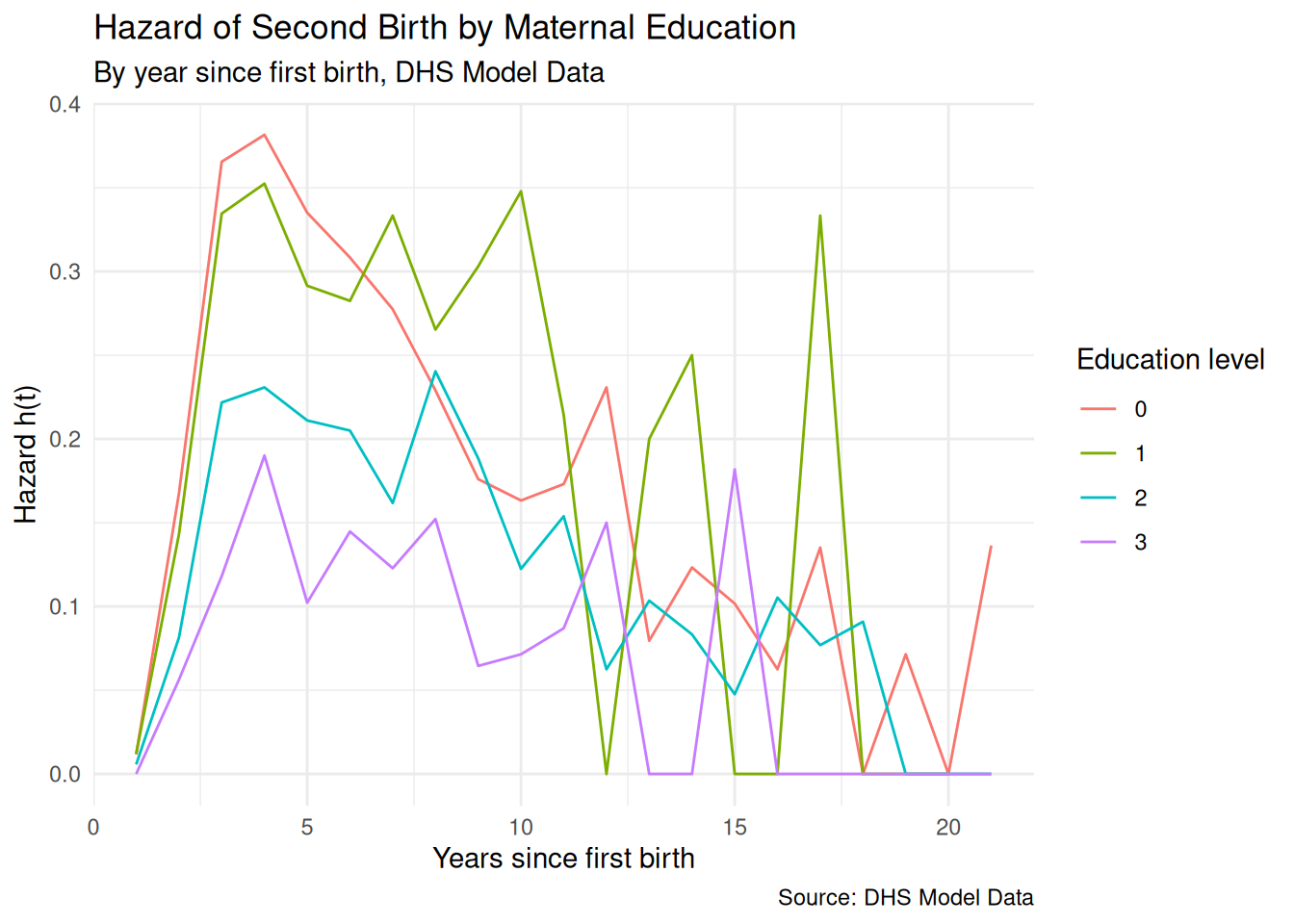 dat_pred <-expand.grid(year =1:20, educ =c(0, 1, 2, 3))dat_pred$hazard <-as.numeric(predict(fit.1, newdata = dat_pred, type ="response"))dat_pred %>%ggplot(aes(x = year, y = hazard,color =factor(educ), group =factor(educ))) +geom_line() +labs(title ="Predicted Hazard of Second Birth by Maternal Education",x ="Years since first birth",y ="Predicted h(t)",color ="Education level",caption ="Source: DHS Model Data" ) +theme_minimal()