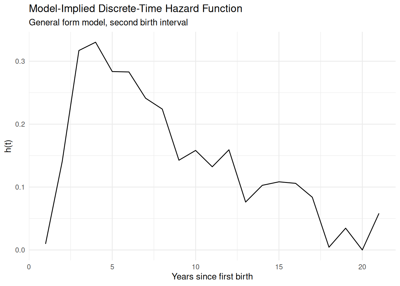 # Plot the model-implied baseline hazardhaz <-1-exp(-exp(coef(fit.0)))time <-seq_along(haz)data.frame(time = time, hazard = haz) %>%ggplot(aes(x = time, y = hazard)) +geom_line() +labs(title ="Model-Implied Discrete-Time Hazard Function",subtitle ="General form model, second birth interval",x ="Years since first birth",y ="h(t)" ) +theme_minimal()