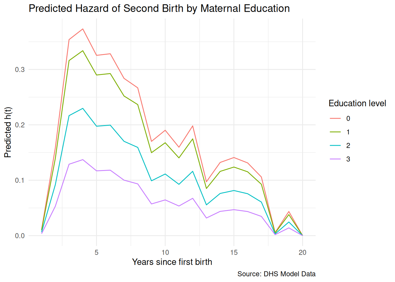 We can also generate predicted hazard functions for different types of women by evaluating the model at specified covariate values, which gives a direct visual representation of how education modifies the timing and probability of a second birth.