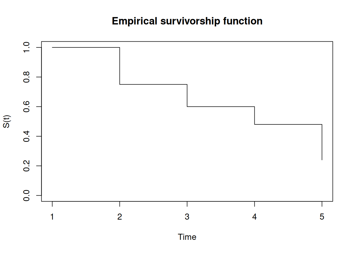Empirically, \(S(t)\) takes the form of a step function that drops at each observed event time. The code below constructs such a step function from a simple counting process table, illustrating the product-limit logic that underlies the Kaplan-Meier estimator:
