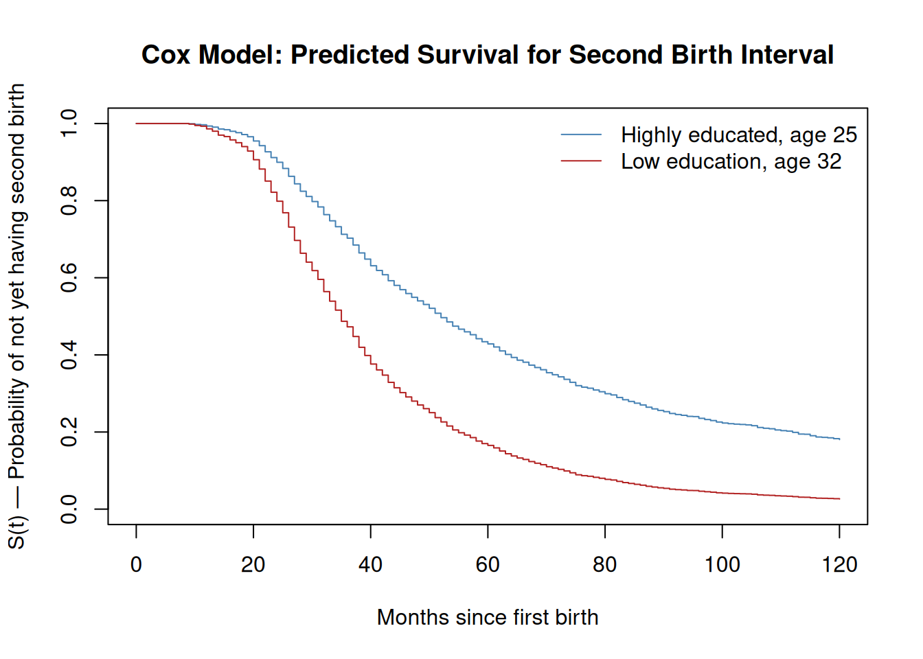 One of the most effective ways to communicate Cox model results to a substantive audience is to plot the predicted survival or hazard functions for a set of interesting, contrasting cases — what the model implies about the timing of the second birth for, say, a highly educated woman in her mid-twenties versus a woman with no secondary education in her early thirties. The survfit() function applied to a fitted Cox model generates these curves by evaluating the product-limit estimator on the baseline hazard and then adjusting it by the risk score of the specified individual.