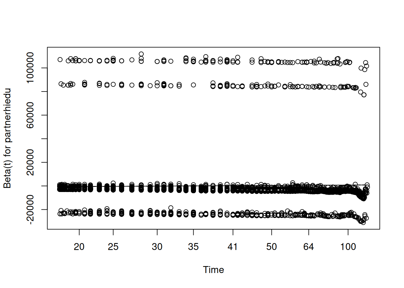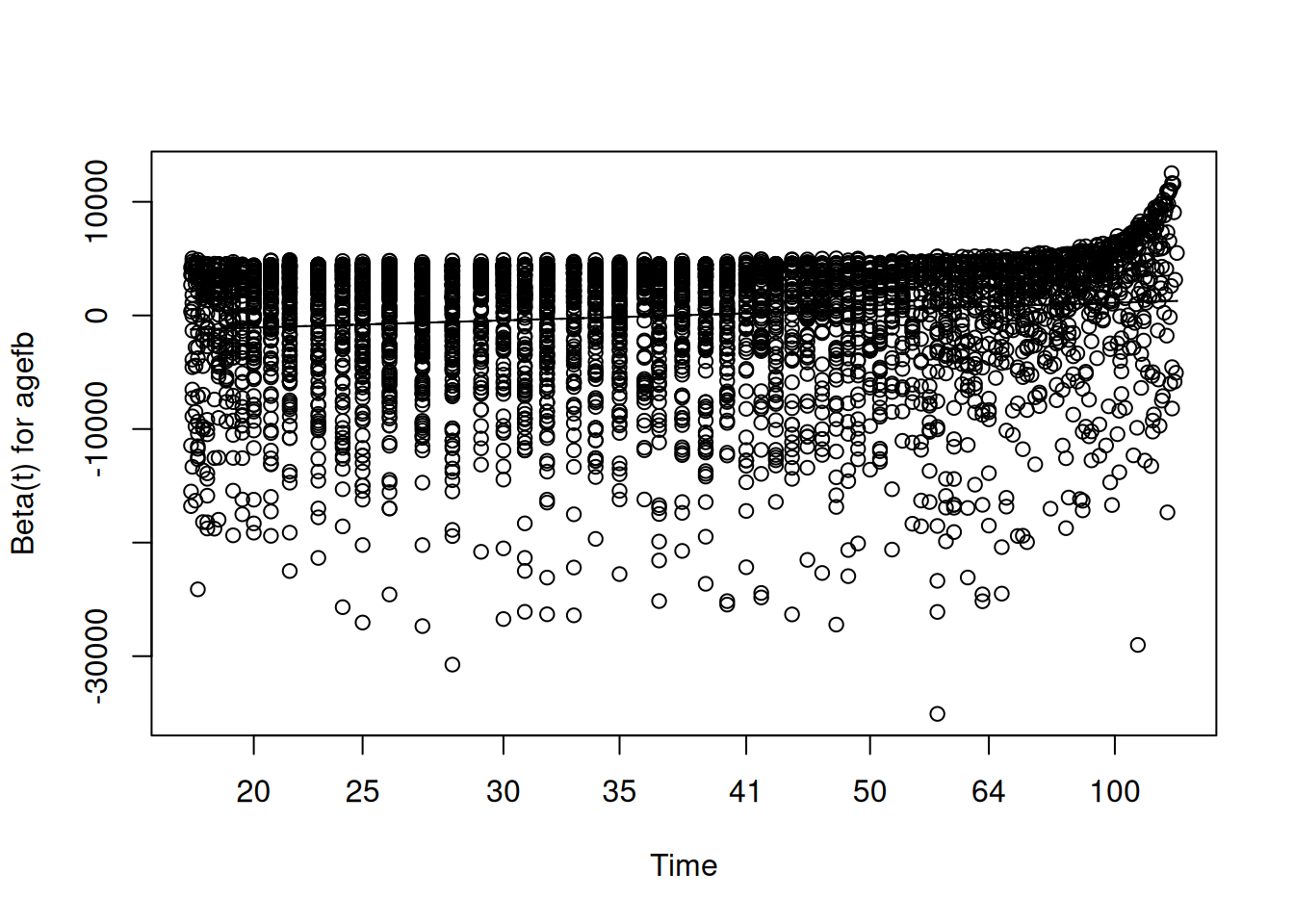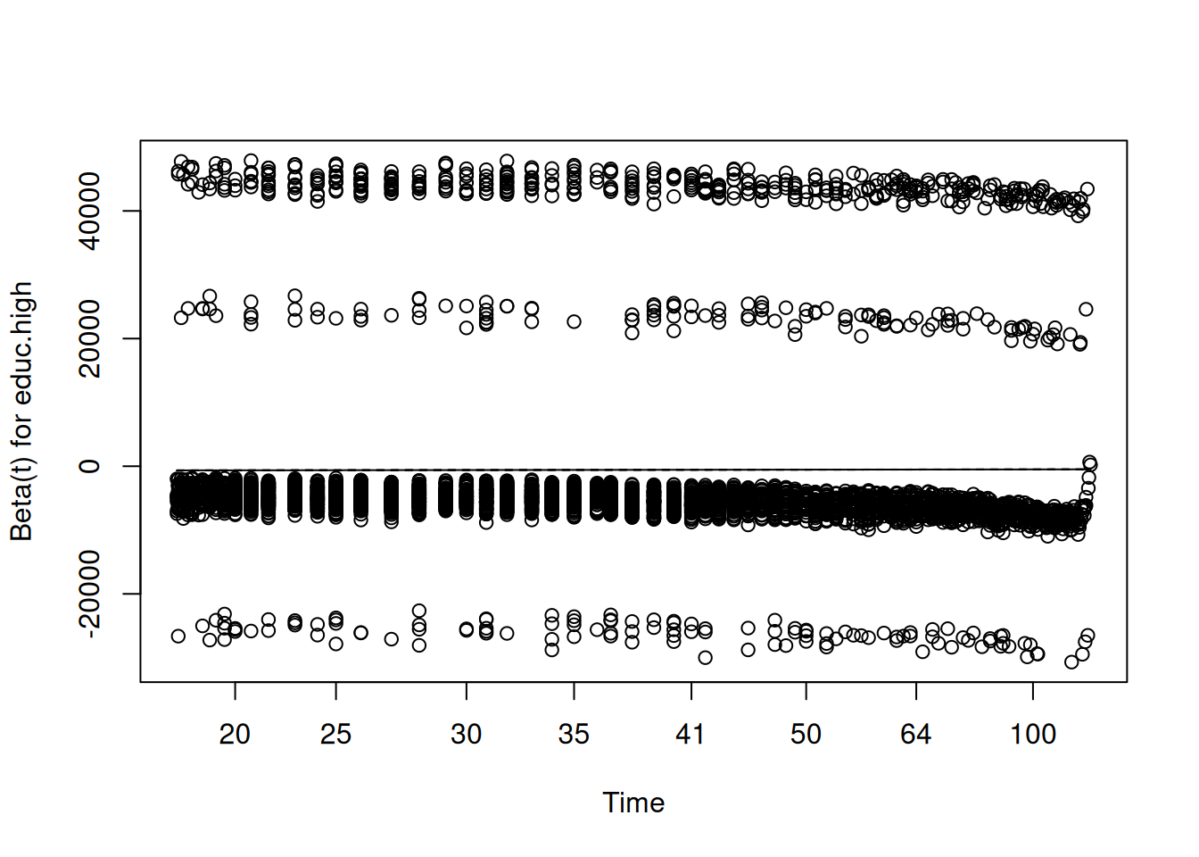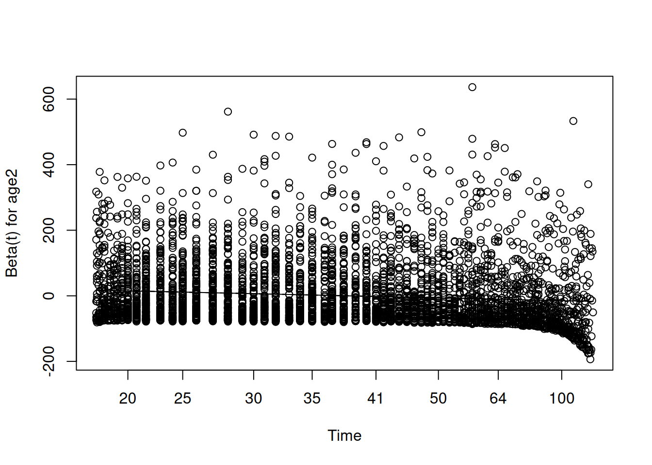 The standard diagnostic for this assumption uses Schoenfeld residuals, proposed by (grambsch_proportional_1994?). At each observed failure time, the Schoenfeld residual for a covariate is the difference between the observed value of that covariate for the person who failed and its expected value given the risk set at that time. If the proportional hazards assumption holds, these residuals should show no systematic trend over time: they should scatter randomly around zero regardless of where in the follow-up period we look. A significant correlation between the Schoenfeld residuals and time is evidence of non-proportionality.