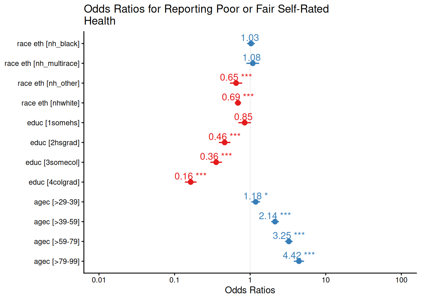 A useful visual summary of the odds ratios and their confidence intervals can be produced with plot_model() from the sjPlot package (sjPlot?). In this plot, an odds ratio of 1 means no difference relative to the reference group; values above 1 indicate increased odds of poor or fair health, and values below 1 indicate decreased odds.